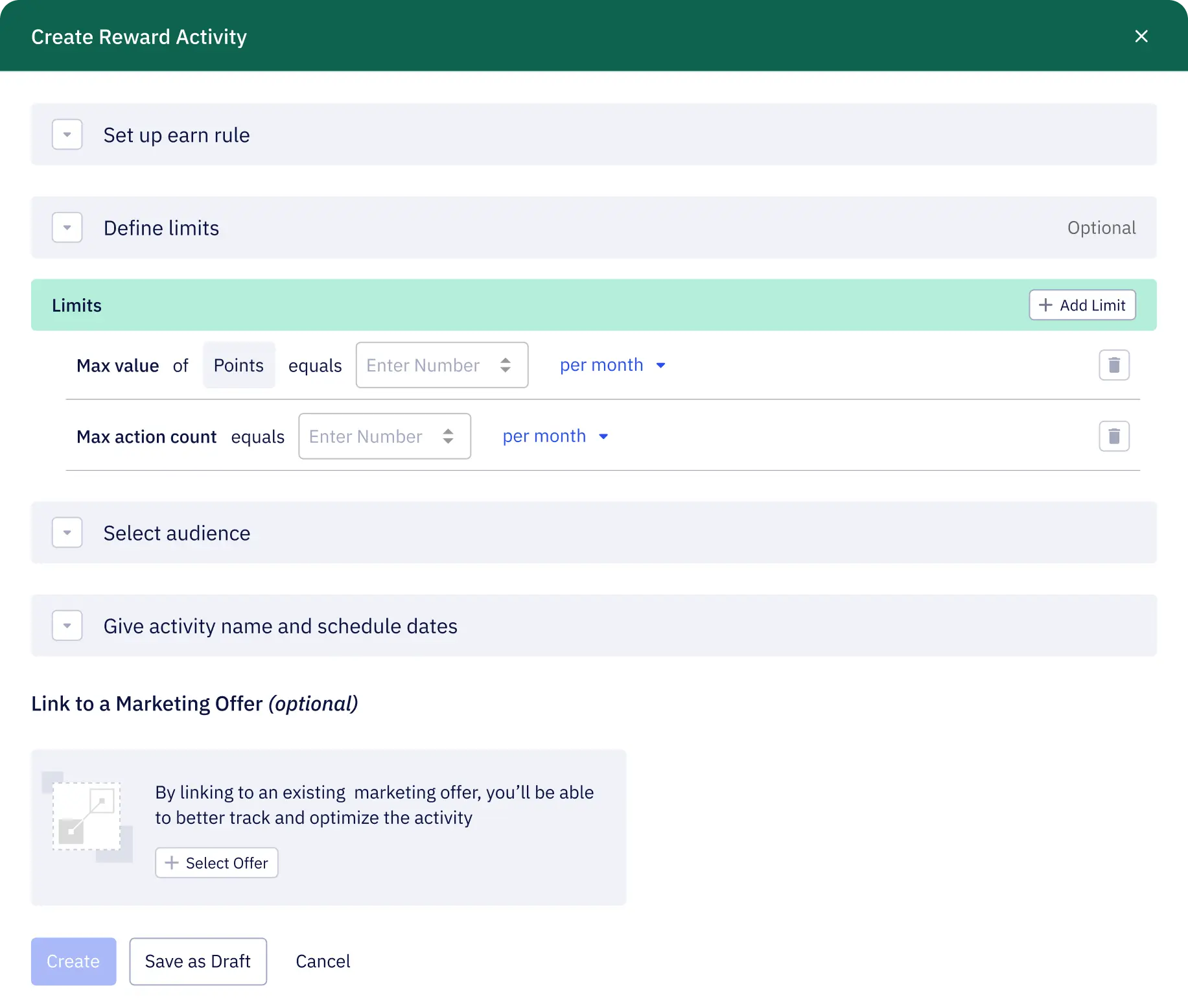 Offer customers the choice to earn rewards across transaction types, user behaviors, or lifecycle events: